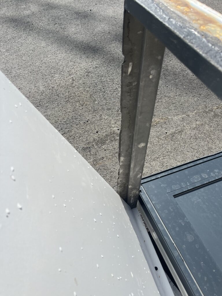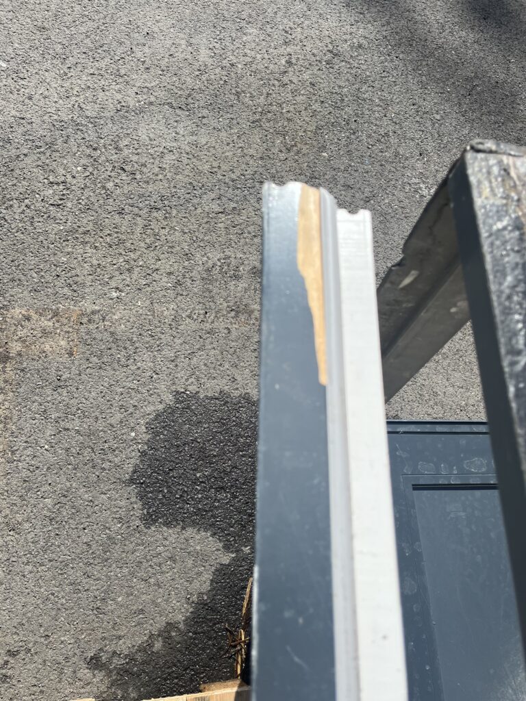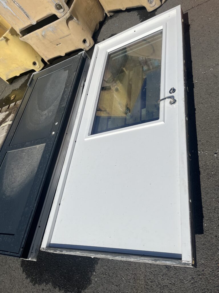 Lítillega skemmd útihurð hæð 219 cm breidd 98 cm. Ál að utan, timbur að innan.